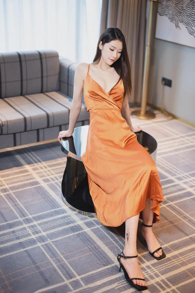 橘色深V吊带长裙,脚踩黑色一字带高跟凉鞋,深V的领口大开,将方子萱丰满有料的胸部曲线展现得淋漓尽致。▼