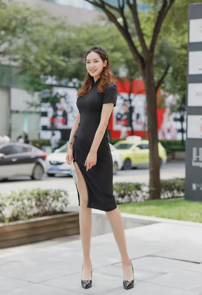 黑色高开衩新中式旗袍裙,修身的剪裁,将方子萱凹凸有致的身材完美的勾勒出来,搭配肉色和黑色高跟鞋,旗袍确实显身材,而且很有韵味。▼