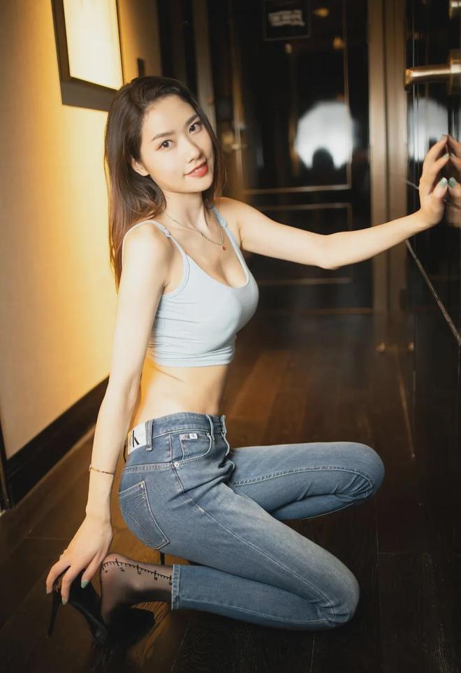 淡蓝色露脐小吊带,搭配深色紧身窄腿牛仔裤,内搭黑丝,脚踩黑色高跟鞋,裤里丝,是今年特别流行的穿搭方式,尤其是这种带刻度的黑丝,更是诱惑力满分。▼