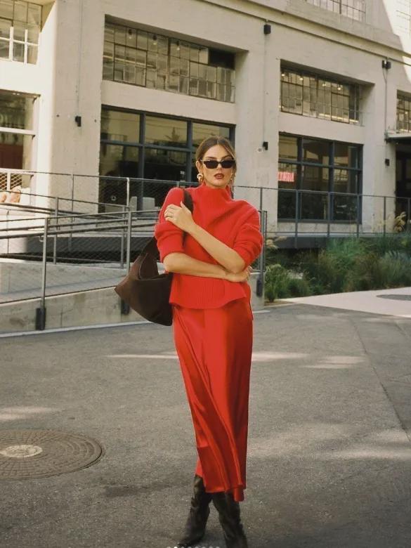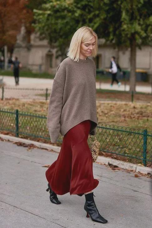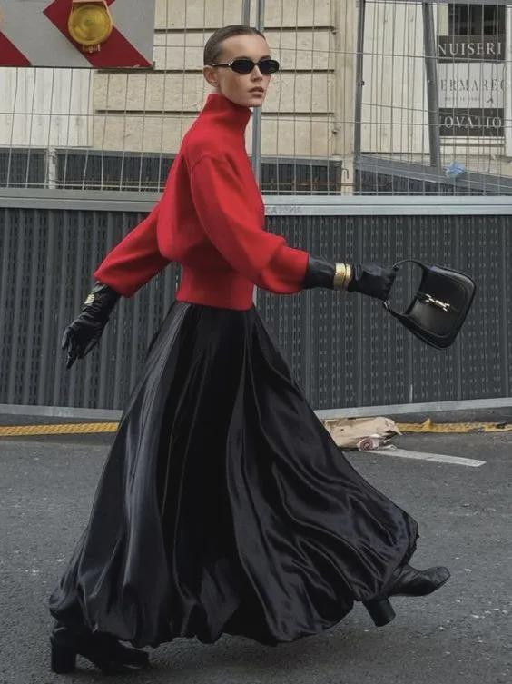 一件黑色烟灰色针织毛衣,凸显出女性独立大方的独特气质,绽放出精致自信的迷人光彩 ,搭配一双红色半裙,更是能在不经意间展现出穿搭的精致与时尚品味,搭配一双黑色靴子,打造出一种干练且极具气场的形象