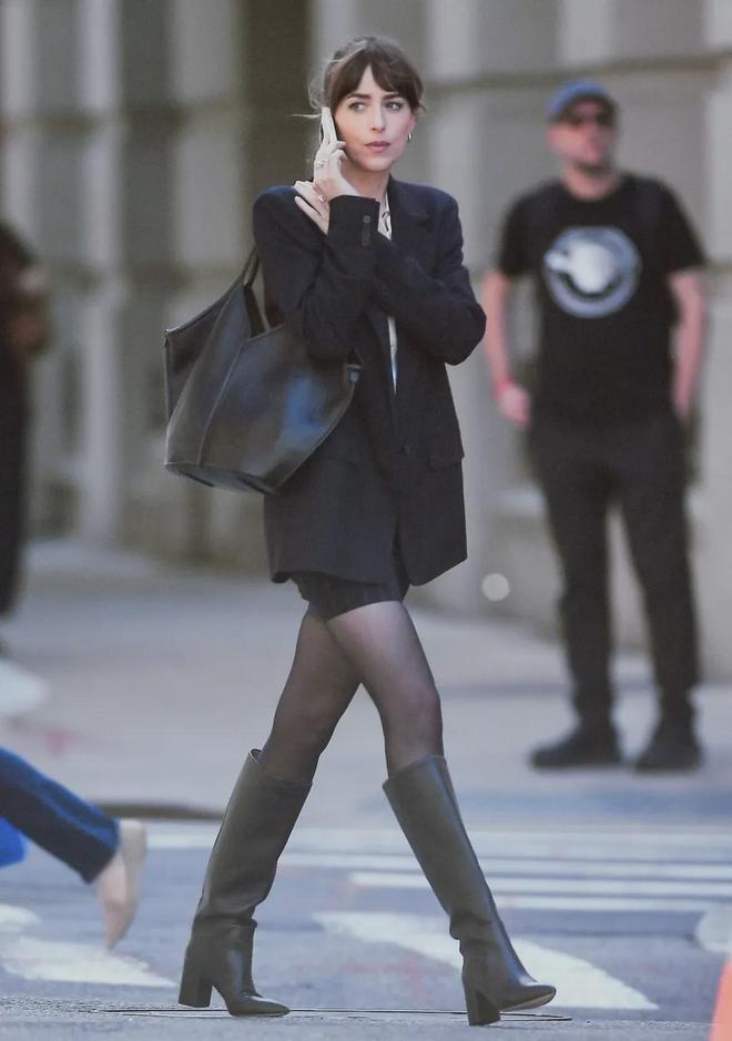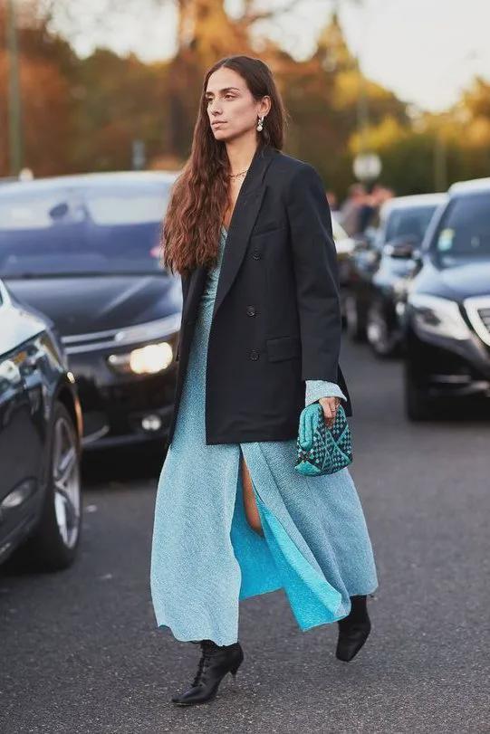 黑色西装外套,以一种独特的中性之美,展现出非凡气质,内搭蓝色连衣裙,可以大步迈出的自信与潇洒,够穿出了一种不受约束的独立女性气质,再精心挑选一双黑色靴子,展现出女性的优雅又松弛随性的高级美