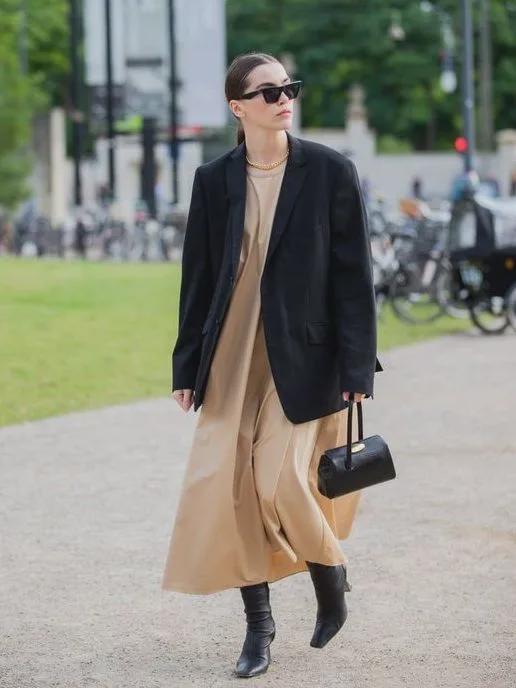 黑色西装外套,能够不费力的展现女性的柔美与优雅,内搭卡色连衣裙,穿出了又酷又飒的时髦高级感,营造随性又自在的时髦,搭配一双黑色靴子,展现出别样的大女人个性风度,谁都可以轻松穿出时髦感,释放出了一种自由与独立大气的气场