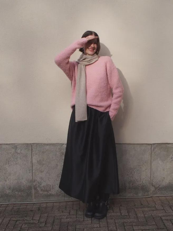 粉色针织,轻松穿出率性雅致的韵味,内搭黑色半裙,带来一种自在而不羁的时尚态度,散发着独有的风采,搭配一双黑色靴子,成为不同身材女性展现自身魅力的得力时尚助手,更是能让你的气质翻倍