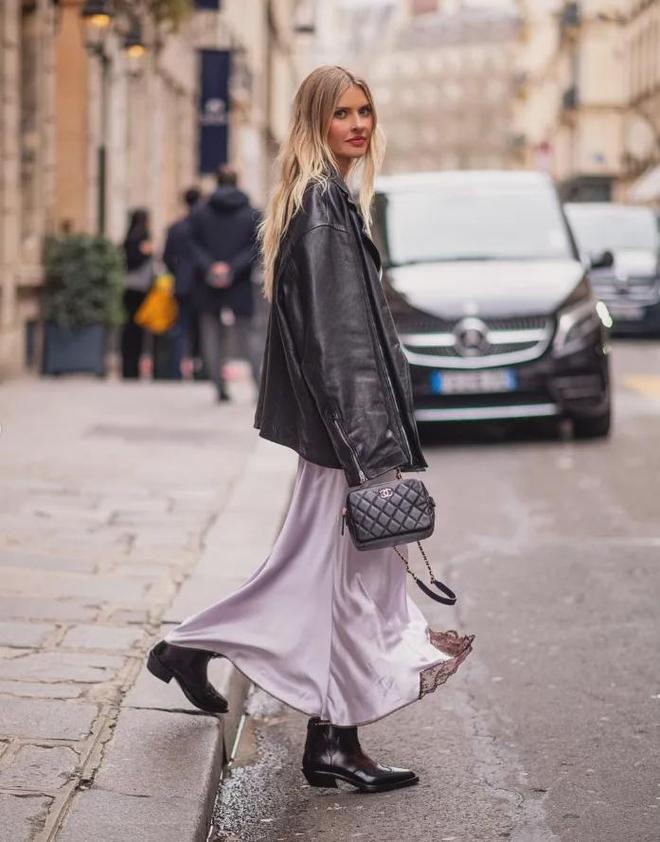 黑色皮衣外套,让整个人由内而外散发出松弛又精致的气质,释放出大女人落落大方的自信气场,搭配紫色真丝半裙,让人百看不厌,成为经久不衰的经典搭配范式,搭配一双黑色靴子,不用刻意去凹造型,让你瞬间尽情释放你的独特魅力