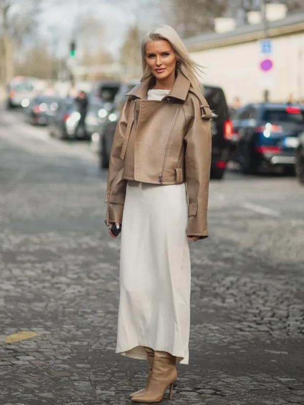 卡色皮衣外套,散发出一种帅气与干练的氛围,毫不费力的穿出了飒爽的大女人气质,内搭的白色连衣裙,瞬间穿出给人独特的质感,展现出别样的大女人个性风度,搭配一双卡色靴子,还让穿者呈现出一种不经意的时尚魅力
